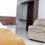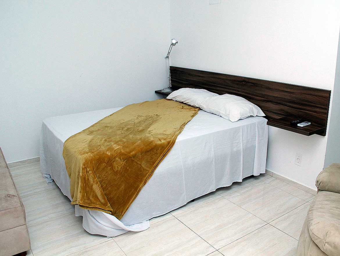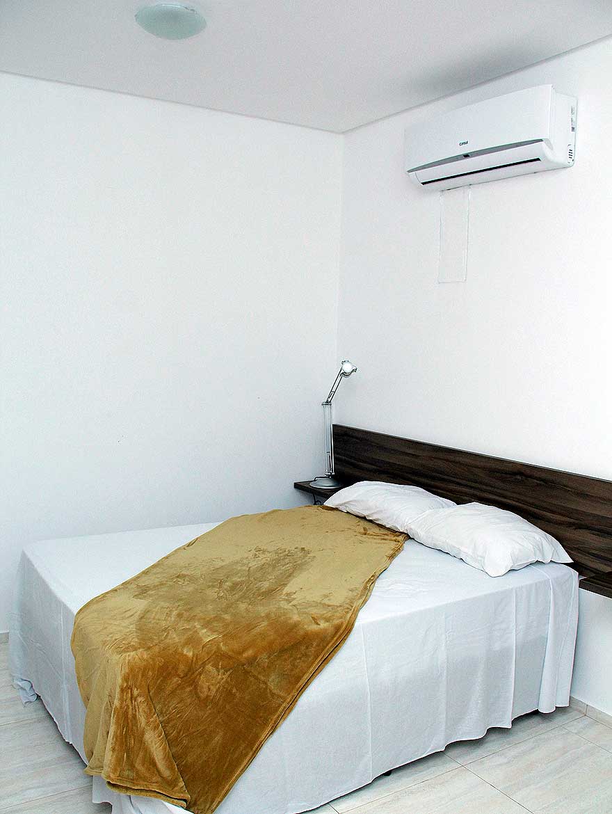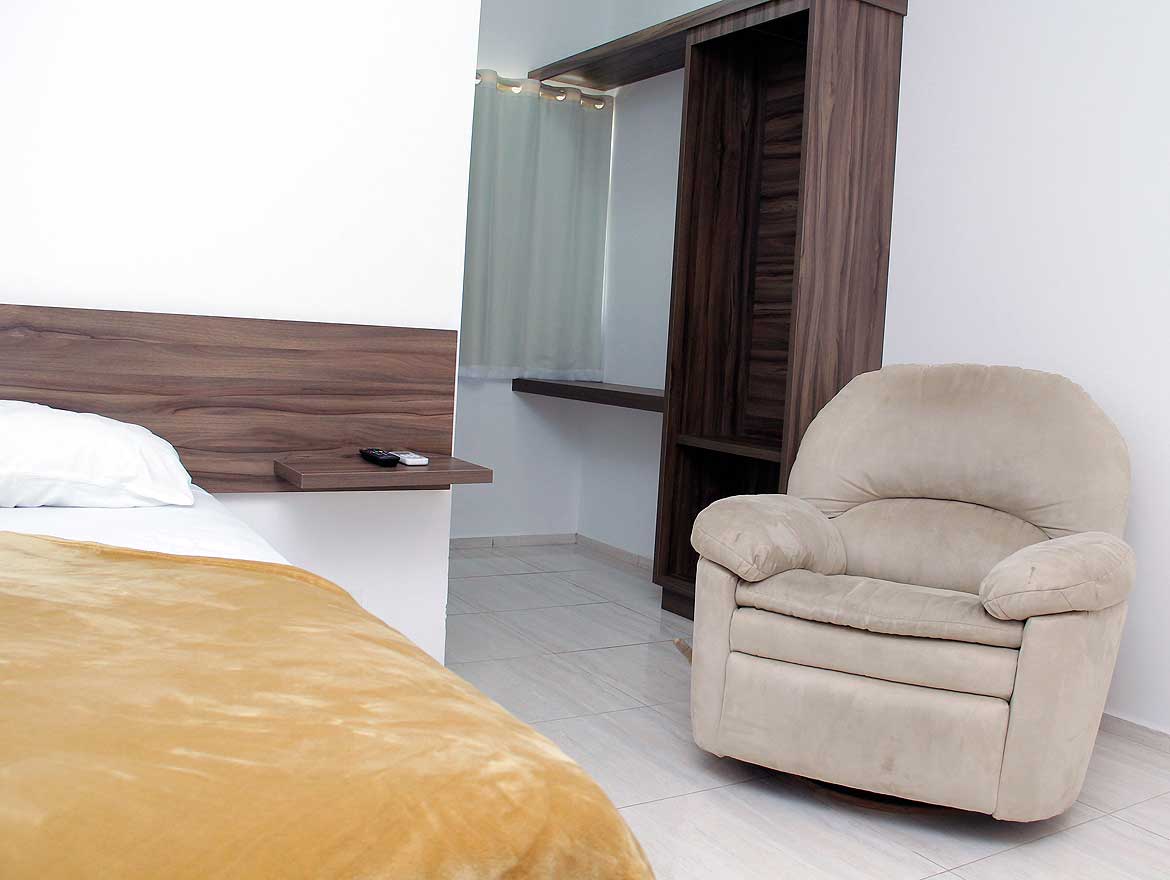 Nossa Suíte Casal, dispõe de ampla cama de casal, TV LCD para assistir seus programas favoritos, ambiente climatizado com ar condicionado, poltrona de descanso, frigobar, mesa de trabalho com acesso Wi-fi gratuito, armário para suas bagagens e banheiro com box em vidro temperado.